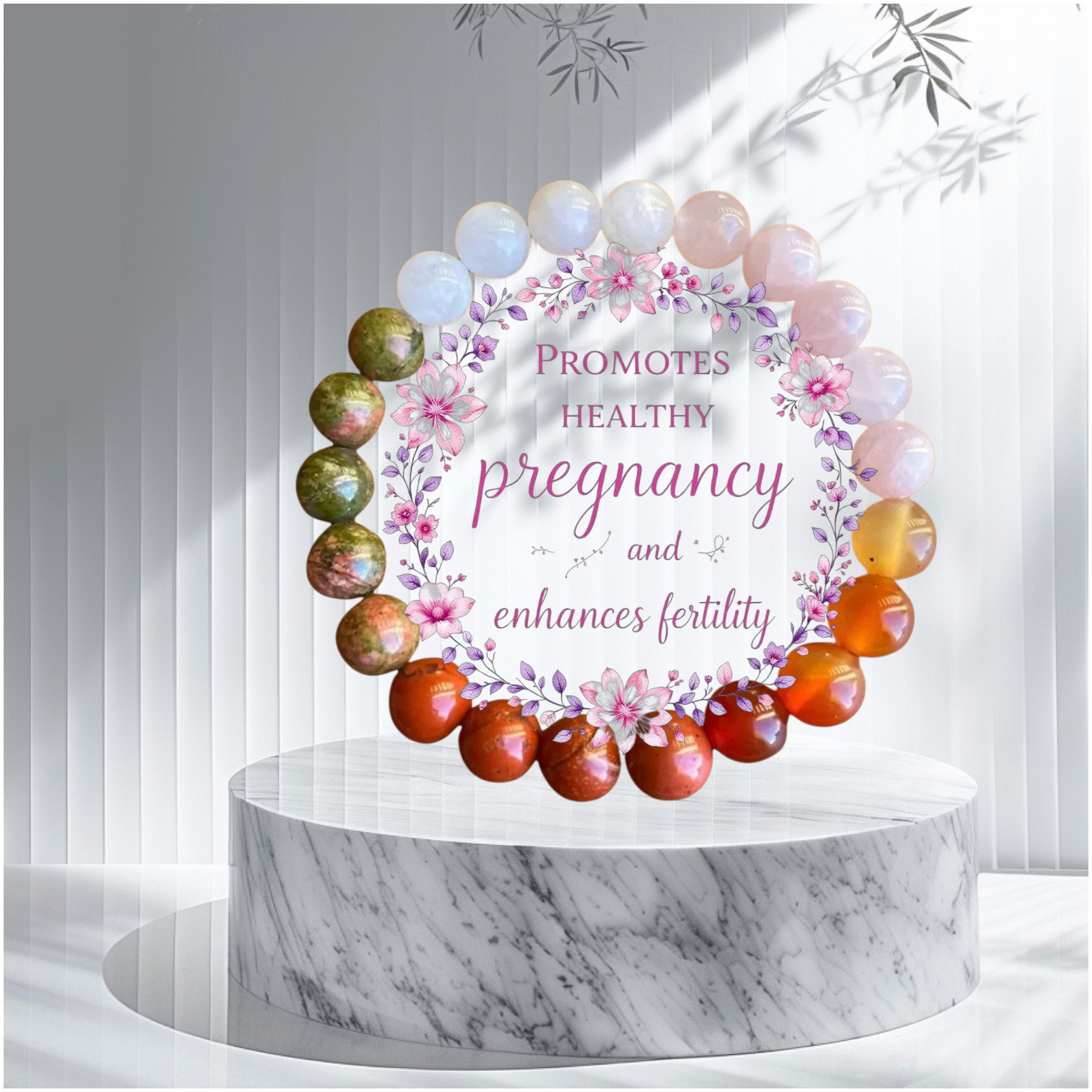 Made with genuine healing stones like Moonstone, Rose Quartz, and Carnelian — traditionally believed to nurture reproductive health and hormonal balance — this bracelet is a meaningful gift for women trying to conceive or expecting mothers.